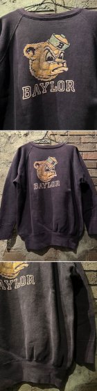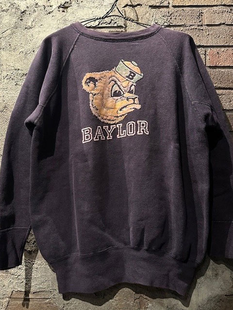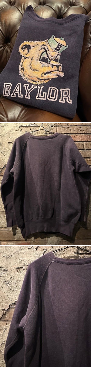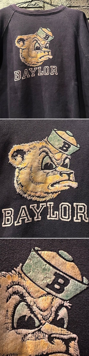 ・当該個体は 【 カラーフロッキー系ビンテージスウェット及び、フーディー 】 の中でも特に、素晴らしい経年昇華を遂げるとされる所謂、 《 ネイビー/ナス紺 》 系のカラー。フロントに施された同 “ BAYLOR ” 大学のマスコットキャラは何とも愛らしくてムード満点。ネイビーボディーに施されたカラーフロッキーの配色はもちろんのこと、何より近年、非常に入手が難しくなっている、ゆったり、たっぷりサイズのミント個体。その仕様や意匠からおおよそ、1960年代頃の個体と推測することが出来ます。この機会をお見逃しなく。