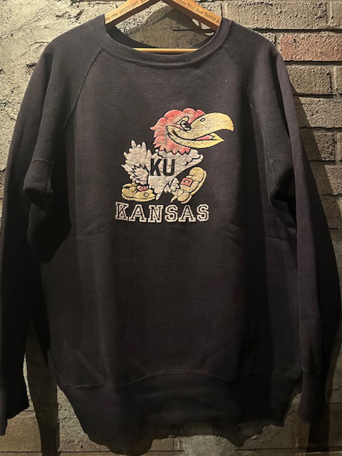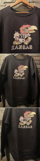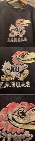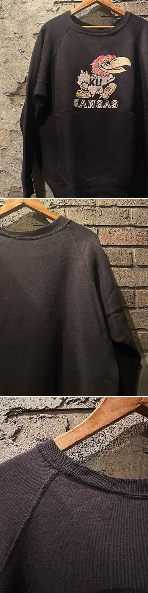 ・当該個体は 【 サンフェイド系ビンテージ 】 のスウェットやフーディーの中でも特に、素晴らしい経年昇華を遂げるとされる所謂、 《 ブラック 》 カラー。フロント部にはカンザス大学のカレッジマスコットマスコット “ ジェイホーク ” のカラーフロッキーグラフィックプリントが。誰の眼にもユニークで愛らしいグラフィックは古き良き時代のアメリカそのもの。